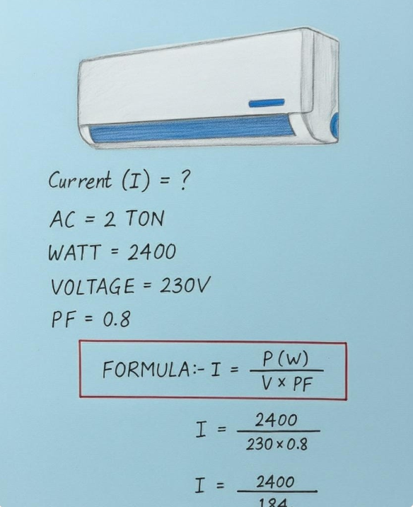 Calculation for determining the current (`I`) drawn by an air conditioner (AC).